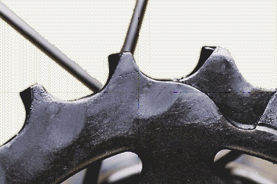 A 3. képen két egyforma típusú fogaskereket láthatunk a jobb oldalukról nézve. A közelebbi nagyon kopott, a távolabbi teljesen új. Az új fogaskeréken a görgő mindenhol a tengelyhez képest 90 fokban adja át a terhelést a fogra, míg a kopotton először fel kell másznia az emelkedőre és 90 foknál kisebb szöget zár be az erőkar. A görgő addig fut fel erre az emelkedőre, míg a fogaskerék akkora effektív átmérővel rendelkezik, amilyen mértékben a kopott lánc hosszabb.